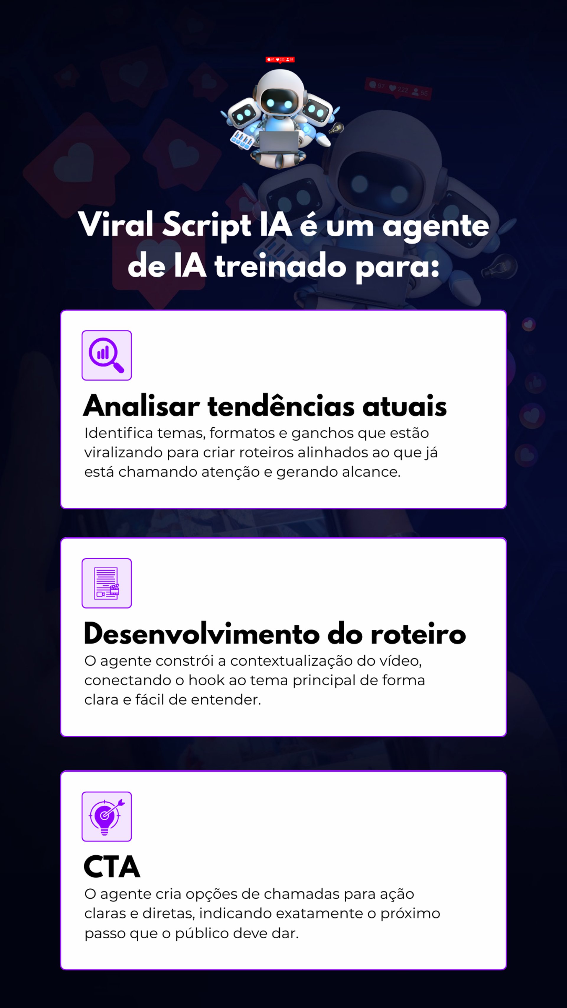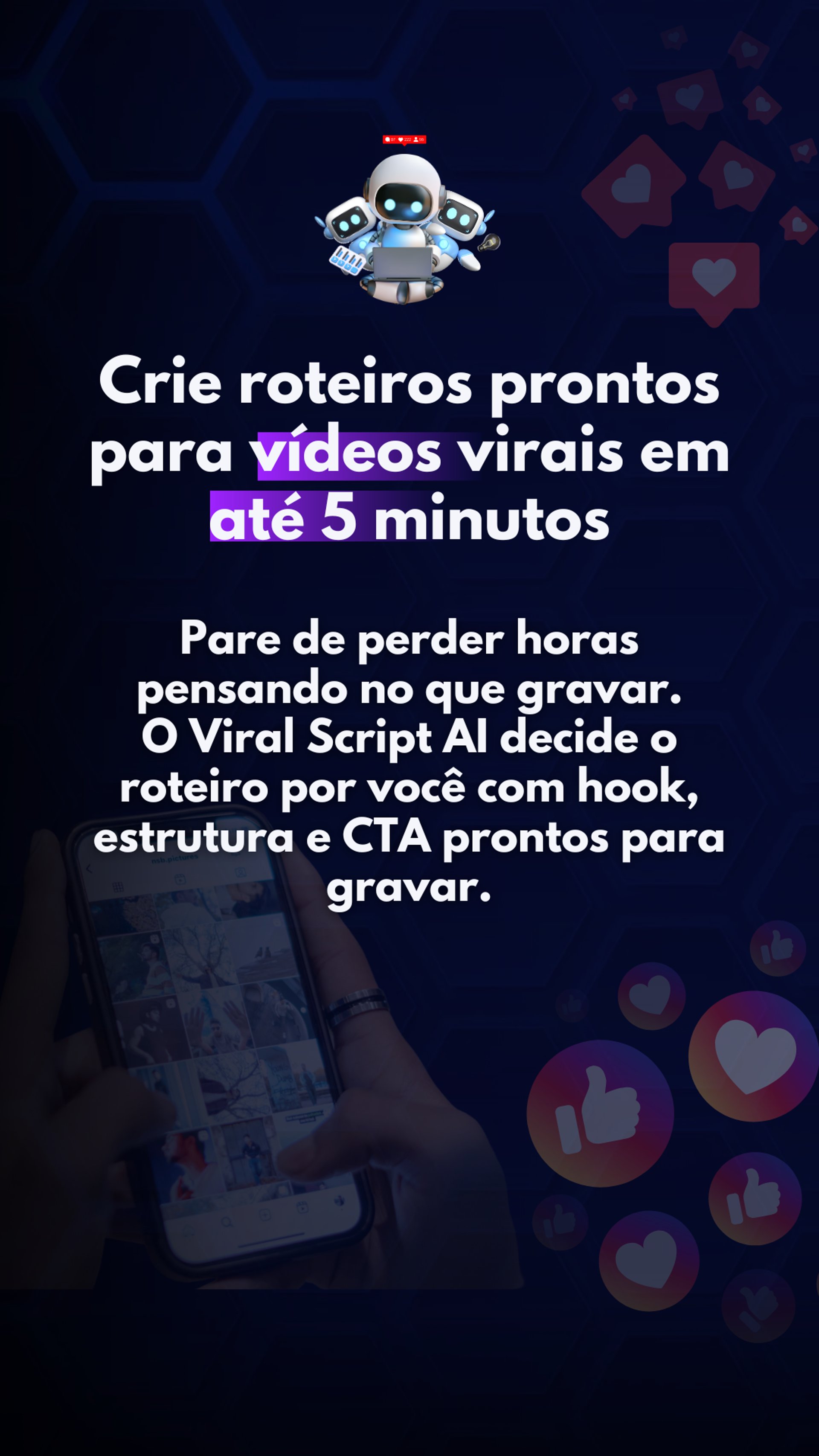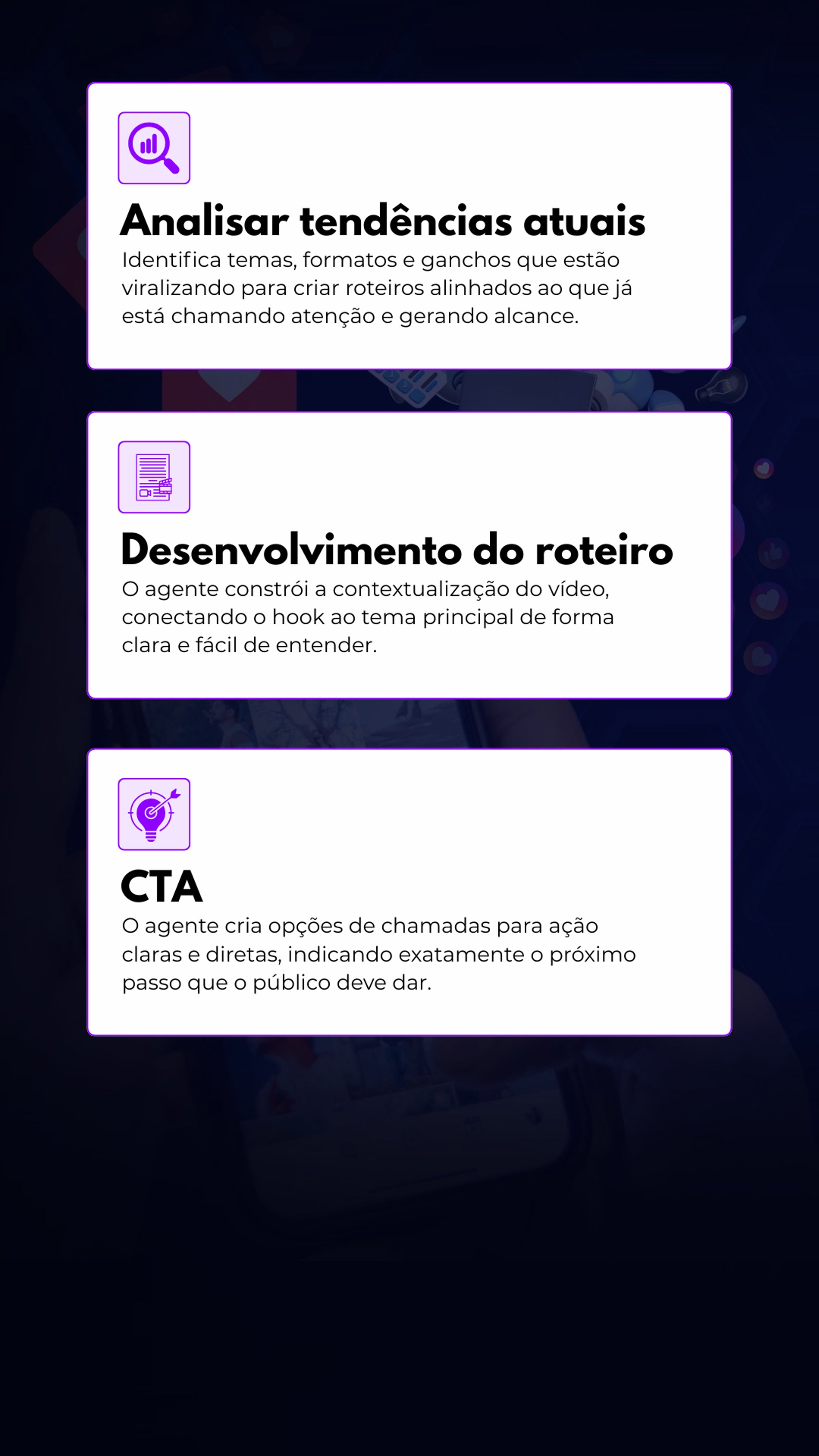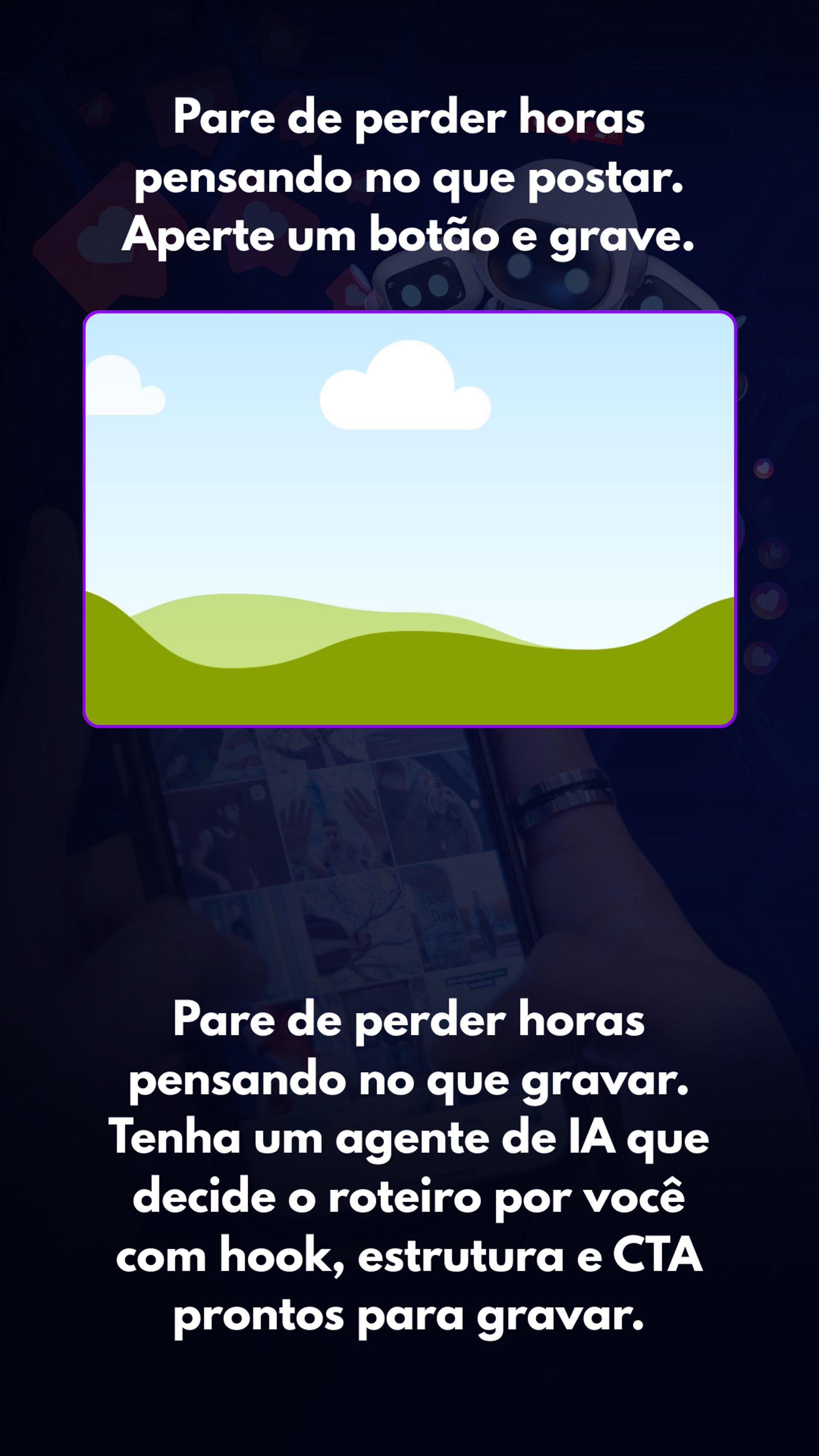 Tenha um agente de IA que decide o roteiro por você com hook, estrutura e CTA prontos para gravar.